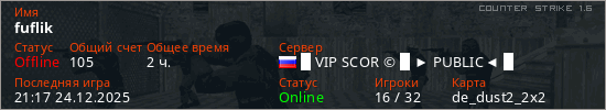 Играет на Counter Strike 1.6 сервере. Страна: РоссияПервый раз замечен 14:40 10.12.2025