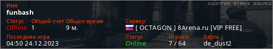 Играет на Counter Strike Source сервере. Страна: РоссияПервый раз замечен 03:03 27.11.2023