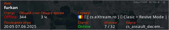 Играет на Counter Strike 1.6 сервере. Страна: РумынияПервый раз замечен 21:40 15.12.2024