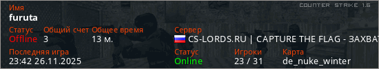 Играет на Counter Strike 1.6 сервере. Страна: РоссияПервый раз замечен 17:01 29.01.2025