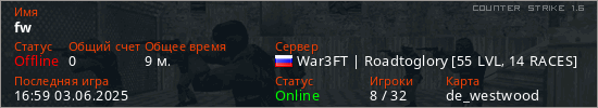Играет на Counter Strike 1.6 сервере. Страна: РоссияПервый раз замечен 14:53 03.06.2025