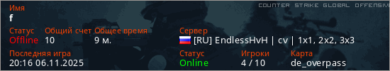 Играет на Counter Strike Global Offensive сервере. Страна: РоссияПервый раз замечен 14:30 05.11.2025