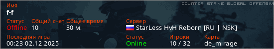 Играет на Counter Strike Global Offensive сервере. Страна: РоссияПервый раз замечен 23:21 23.11.2025