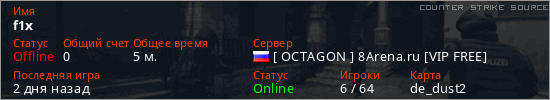 Играет на Counter Strike Source сервере. Страна: РоссияПервый раз замечен 17:32 26.04.2026