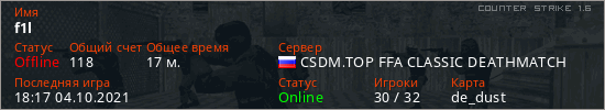 Играет на Counter Strike 1.6 сервере. Страна: РоссияПервый раз замечен 16:21 28.09.2021