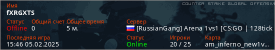 Играет на Counter Strike Global Offensive сервере. Страна: РоссияПервый раз замечен 14:56 05.02.2025