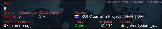 Играет на Counter Strike Global Offensive сервере. Страна: РоссияПервый раз замечен 13:25 19.04.2026
