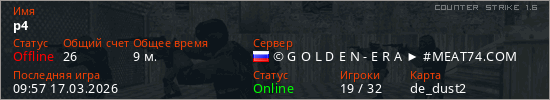 Играет на Counter Strike 1.6 сервере. Страна: РоссияПервый раз замечен 09:51 17.03.2026