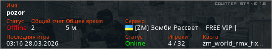 Играет на Counter Strike 1.6 сервере. Страна: УкраинаПервый раз замечен 03:10 28.03.2026