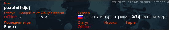 Играет на Counter Strike Global Offensive сервере. Страна: РоссияПервый раз замечен 21:05 27.02.2026