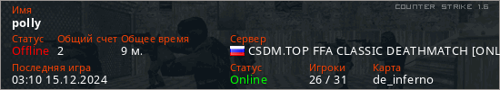 Играет на Counter Strike 1.6 сервере. Страна: РоссияПервый раз замечен 02:47 28.11.2024