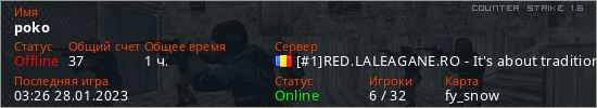 Играет на Counter Strike 1.6 сервере. Страна: РумынияПервый раз замечен 01:57 26.12.2022