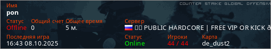 Играет на Counter Strike Global Offensive сервере. Страна: РоссияПервый раз замечен 16:30 08.10.2025