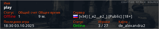 Играет на Counter Strike Source сервере. Страна: РоссияПервый раз замечен 17:38 03.10.2025