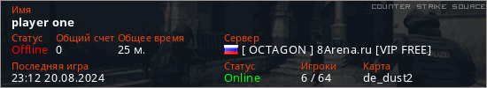 Играет на Counter Strike Source сервере. Страна: РоссияПервый раз замечен 00:14 18.08.2024