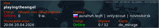 Играет на Counter Strike Global Offensive сервере. Страна: РоссияПервый раз замечен 19:45 20.04.2026
