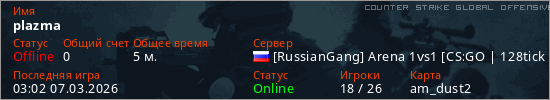 Играет на Counter Strike Global Offensive сервере. Страна: РоссияПервый раз замечен 02:53 07.03.2026