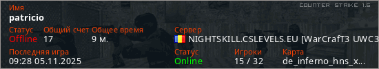 Последний раз был в сети 09:28 05.11.2025 Игрок с таким ником замечен на 3 серверах