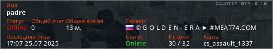 Играет на Counter Strike 1.6 сервере. Страна: РоссияПервый раз замечен 16:47 19.07.2025