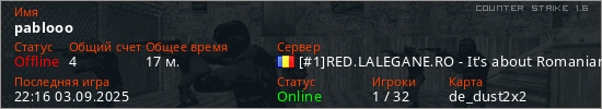 Играет на Counter Strike 1.6 сервере. Страна: РумынияПервый раз замечен 18:43 03.09.2025