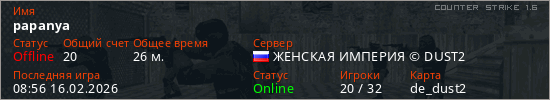 Играет на Counter Strike 1.6 сервере. Страна: РоссияПервый раз замечен 16:27 13.02.2026