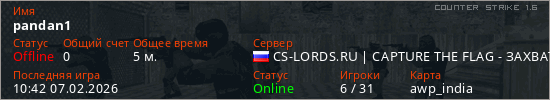 Играет на Counter Strike 1.6 сервере. Страна: РоссияПервый раз замечен 10:38 07.02.2026