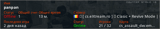 Играет на Counter Strike 1.6 сервере. Страна: РумынияПервый раз замечен 16:18 14.03.2026