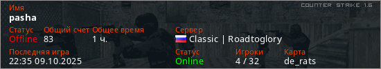 Играет на Counter Strike 1.6 сервере. Страна: РоссияПервый раз замечен 19:42 21.09.2025