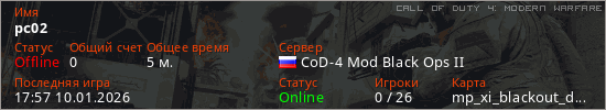 Играет на Call of Duty 4: Modern Warfare сервере. Страна: РоссияПервый раз замечен 17:55 10.01.2026