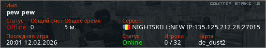 Последний раз был в сети 20:01 12.02.2026 Игрок с таким ником замечен на 16 серверах