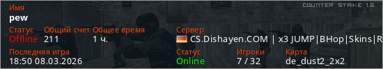 Играет на Counter Strike 1.6 сервере. Страна: ГерманияПервый раз замечен 19:43 04.03.2026