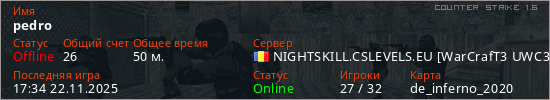 Последний раз был в сети 17:34 22.11.2025 Игрок с таким ником замечен на 35 серверах