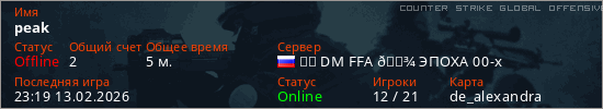 Играет на Counter Strike Global Offensive сервере. Страна: РоссияПервый раз замечен 23:15 13.02.2026