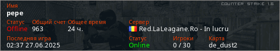 Играет на Counter Strike 1.6 сервере. Страна: РумынияПервый раз замечен 22:42 05.08.2022