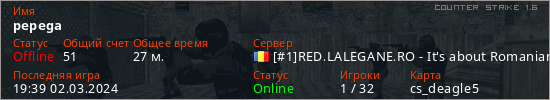 Играет на Counter Strike 1.6 сервере. Страна: РумынияПервый раз замечен 04:07 18.01.2023