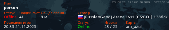 Играет на Counter Strike Global Offensive сервере. Страна: РоссияПервый раз замечен 19:39 21.11.2025