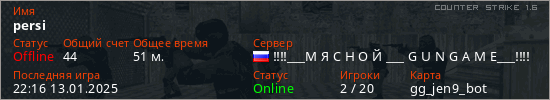 Играет на Counter Strike 1.6 сервере. Страна: РоссияПервый раз замечен 21:51 13.01.2025