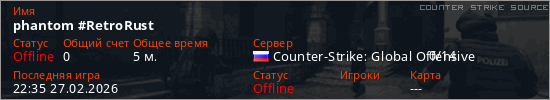 Играет на Counter Strike Source сервере. Страна: РоссияПервый раз замечен 22:27 27.02.2026