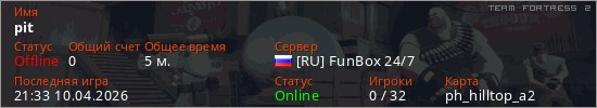 Играет на Team Fortress 2 сервере. Страна: РоссияПервый раз замечен 21:31 10.04.2026