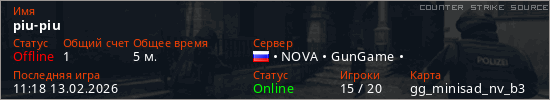 Играет на Counter Strike Source сервере. Страна: РоссияПервый раз замечен 11:16 13.02.2026