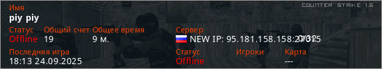 Играет на Counter Strike 1.6 сервере. Страна: РоссияПервый раз замечен 17:17 24.09.2025