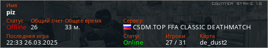 Играет на Counter Strike 1.6 сервере. Страна: РоссияПервый раз замечен 23:33 25.03.2025