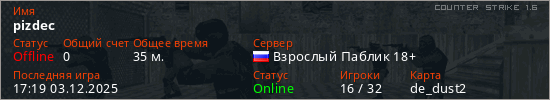 Играет на Counter Strike 1.6 сервере. Страна: РоссияПервый раз замечен 17:15 03.12.2025