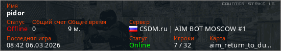 Играет на Counter Strike 1.6 сервере. Страна: РоссияПервый раз замечен 09:42 05.03.2026