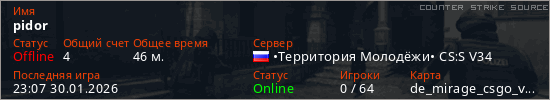 Играет на Counter Strike Source сервере. Страна: РоссияПервый раз замечен 14:27 21.01.2026