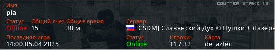 Играет на Counter Strike 1.6 сервере. Страна: РоссияПервый раз замечен 19:43 04.04.2025