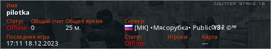 Играет на Counter Strike 1.6 сервере. Страна: РоссияПервый раз замечен 16:56 16.11.2023