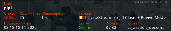 Играет на Counter Strike 1.6 сервере. Страна: РумынияПервый раз замечен 12:56 01.03.2025