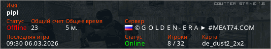 Играет на Counter Strike 1.6 сервере. Страна: РоссияПервый раз замечен 08:48 06.03.2026