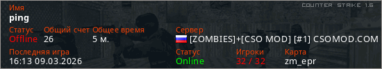 Играет на Counter Strike 1.6 сервере. Страна: РоссияПервый раз замечен 16:05 09.03.2026